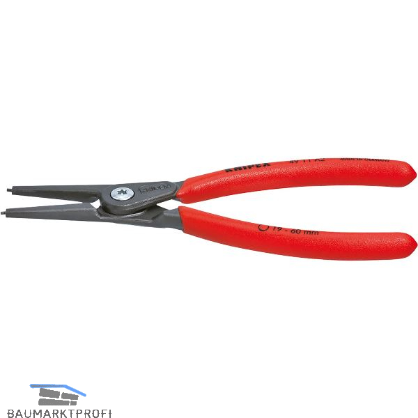 Für Außenringe auf Wellen. Geschmiedete Zange mit eingesetzten Spitzen aus gezogenem Federstahldraht höchster Güte. Hoch belastbar im Dauereinsatz, bis zu 10-fach höhere Standzeit im Vergleich zu herkömmlichen Sicherungsringzangen. Große Auflageflächen an den Spitzen. Mit innenliegender Öffnungsfeder.