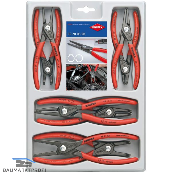 Bestückt mit gängigen Präzisions-Sicherungsringzangen für höchste Anforderungen. Attraktive Verkaufsverpackung mit SB-Lochung auch zur weiteren Aufbewahrung der Zangen geeignet.