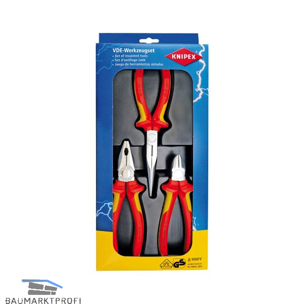 Inhalt:1 VDE Kombizange 180 mm,1 VDE Flachrundzange mit Schneide 200 mm,1 VDE Seitenschneider 160 mm.