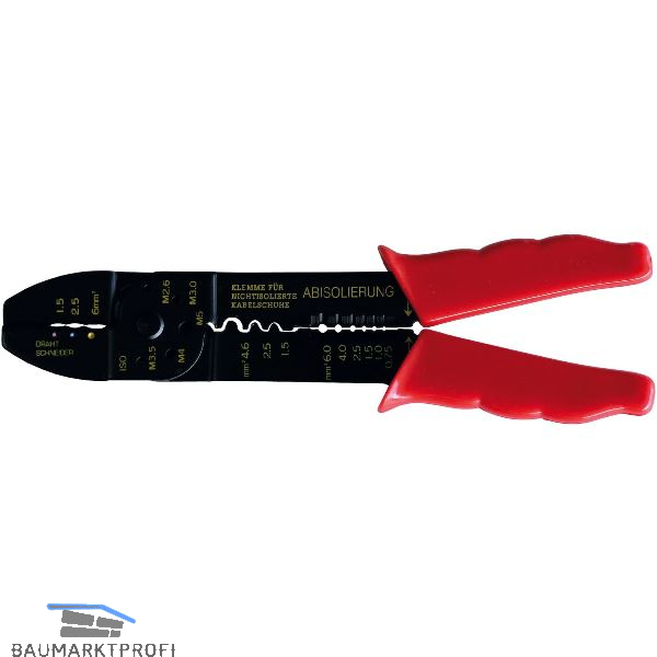 Zum Abisolieren von Drähten und zum Quetschen von Kabelschuhen, mit Gewindelöchern zum Abschneiden von Cu-Ms-Gewindestiften.