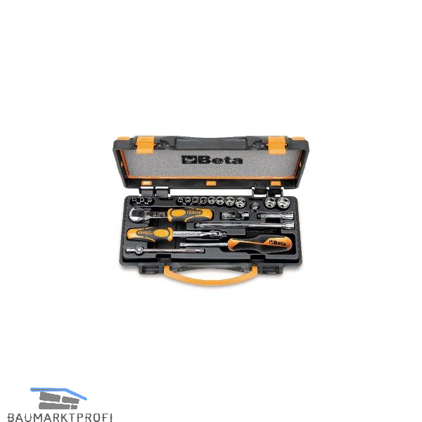 Mit verchromten 6-kant Einsätzen und Betätigungswerkzeugen in Kunststoffbox.
