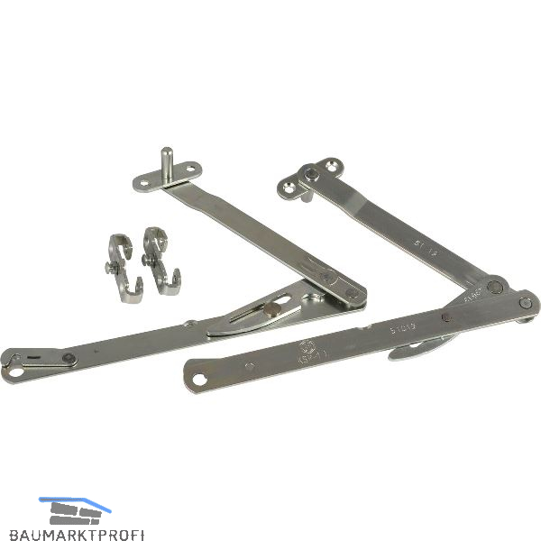 Hinweis: Bei ein- oder auswärtsgehenden Kippflügeln müssen lt. Gesetz zusätzlich zum Oberlichtbeschlag Sicherungsscheren vorgesehen werden, welche die Kippbewegung des Flügels nach dem Aushängen der Öffnerschere begrenzen (Fangstellung).