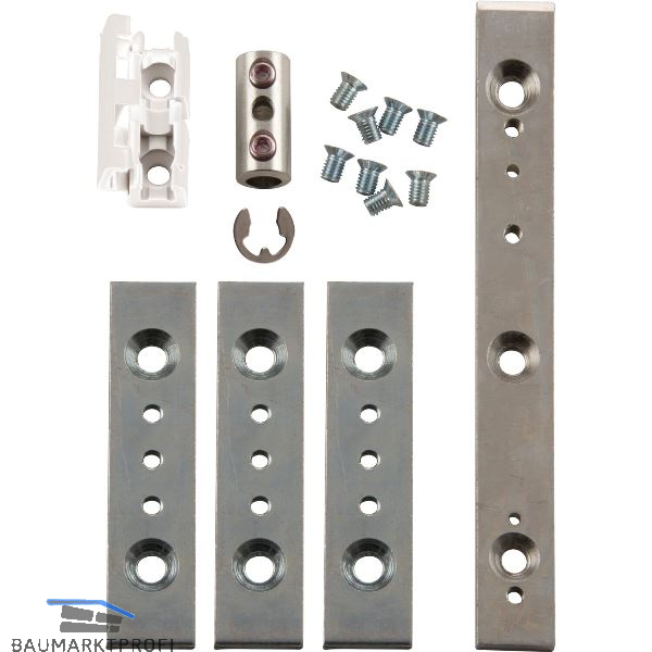 Lieferumfang: 3 Dübelplatten für Klemmführung1 Dübelplatte für Handhebel1 Halterung1 Verbindungsmuffe7 Senkschrauben M5 x 7,5 mm1 Sicherungsscheibe