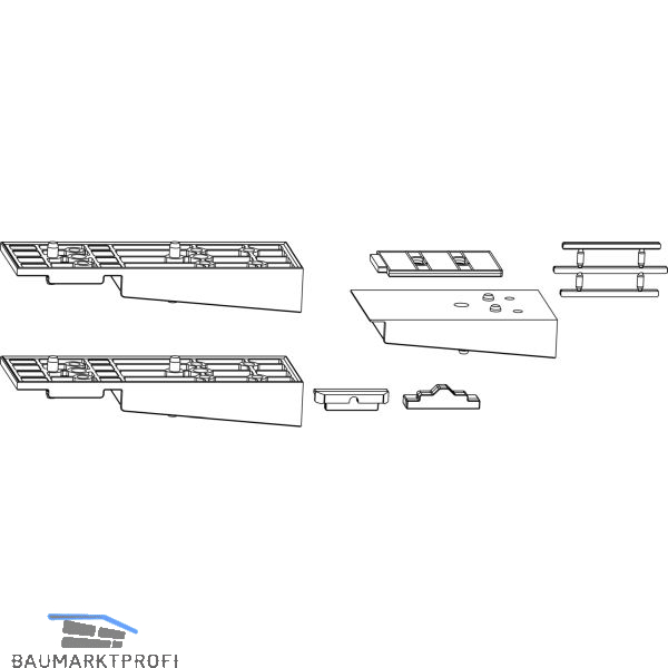 Lieferumfang: 2 Verbindungsplatten 1 Dichtstück für Laufschiene 1 Dichtungsplatte für Zwischenprofil 1 Aufsatzdichtung für Dichtungsplatte 1 Dichtungsstück für Fixflügel 1 Füllstück für Verbindungsplatte und Mitteldichtung