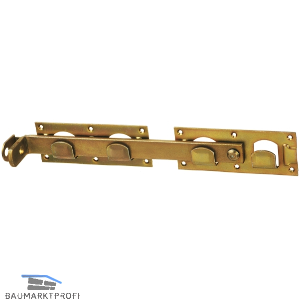 Für zweiflügelige Tore, links und rechts verwendbar. Riegel mit Rundloch ø 12 mm zum Durchziehen des Vorhangschlossbügels. Gesamtlänge fertig montiert 430 mm Anschraubplatte 70 x 180 mm