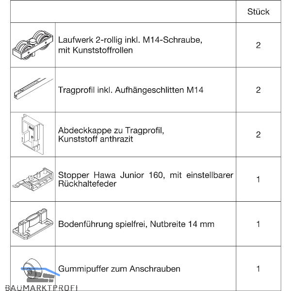 Lieferumfang:2 Laufwerke2 Tragprofile mit Aufhängeschlitten inkl. Schrauben2 Abdeckkappen zu Tragprofil1 Fangstopper mit Rückhaltefeder1 Anschlagpuffer1 Bodenführung