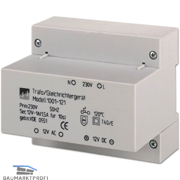 Technische Daten: Nennspannung sekundär 12 V AC und DC DC = 50% Restwelligkeit Nennstrom 1 A / 1,5 A max. 10 s Maße L x B x H 106 x 70 x 73 Montageart aP / Hutschiene Überlastungsschutz Thermoschalter