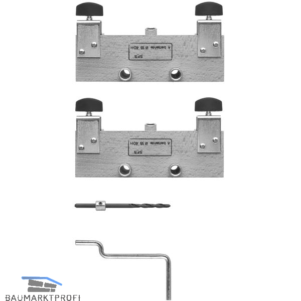 Lieferumfang:1 Paar Bohrlehren1 Stufenbohrer mit Stellring1 Eindrehkopf1 Richtstift (nur bei Bohrlehre für Band ø 18 mm)