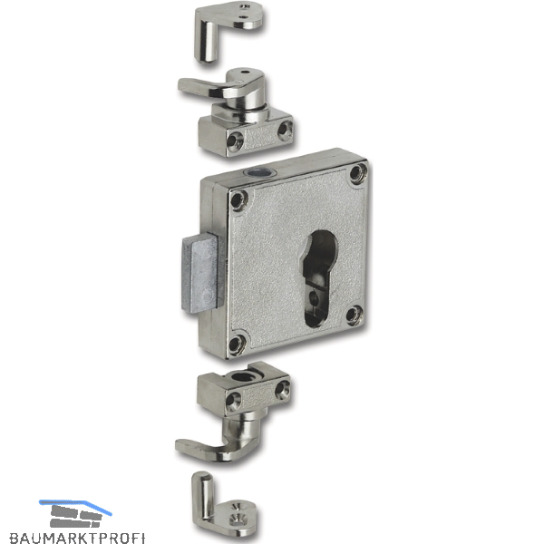 Schlosskasten, 1 Winkelschließblech, 2 Schließhaken, 2 Hakenlager, 2 Schließbolzen, 1 Zylinderbefestigungsschraube M 5 x 30 mm