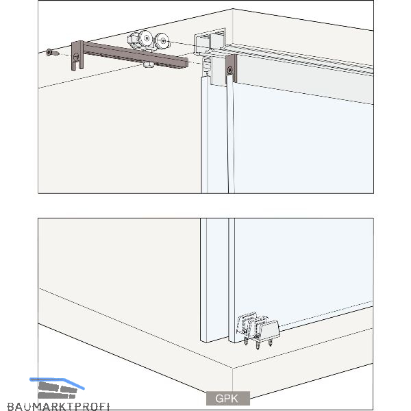 Hawa Clipo 16 GPK/GPPK IS ist ausgelegt für zwei obenlaufende Glastüren bis 16 kg im Design Innenfront. Die Laufschiene wird eingenutet, im Boden hat es keine Nut. Das Glas wird an der Oberkante mit dem Aluminium-Glasfixierungsprofil verklebt. Das Laufwerk für eine verdeckte Montage wird in das Fixierungsprofil integriert. Die Aluminium-Glasfixierungsprofile lassen sich problemlos auf die gewünschten Türbreiten zuschneiden und montieren. Die optionale Dämpfung wird in der Laufschiene integriert.