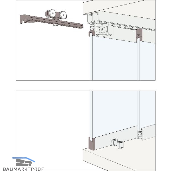 Hawa Clipo 16 GPK/GPPK IS ist ausgelegt für zwei obenlaufende Glastüren bis 16 kg im Design Innenfront. Die Laufschiene wird eingenutet, im Boden hat es keine Nut. Das Glas wird an der Oberkante mit dem Aluminium-Glasfixierungsprofil verklebt. Das Laufwerk für eine verdeckte Montage wird in das Fixierungsprofil integriert. Die Aluminium-Glasfixierungsprofile lassen sich problemlos auf die gewünschten Türbreiten zuschneiden und montieren. Die optionale Dämpfung wird in der Laufschiene integriert.