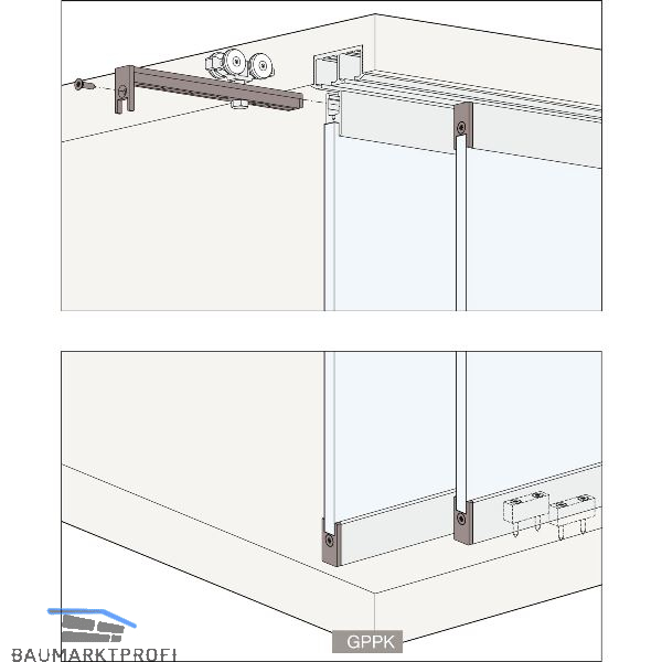 - System: Laufschiene eingenutet oder aufgeschraubt, keine Nut im Boden, ohne Blende, Laufwerk für verdeckte Montage.