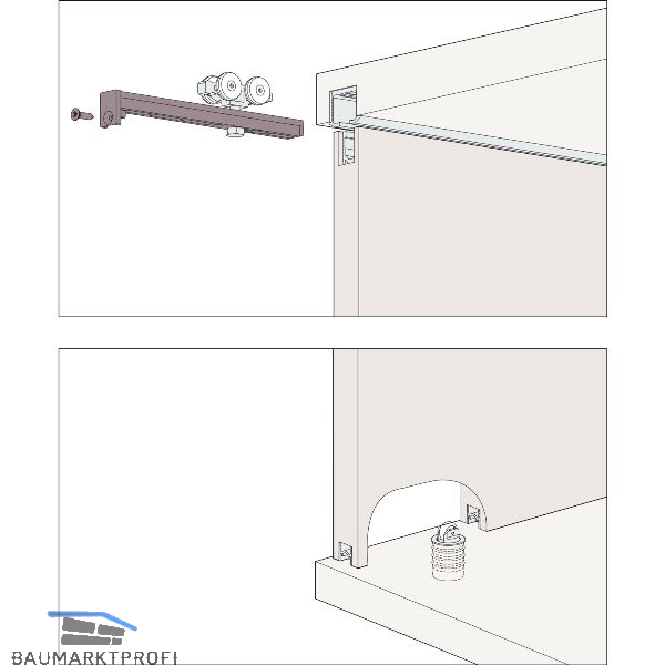- Laufschiene eingenutet, keine Nut im Boden, ohne Blende, Laufwerk für verdeckte Montage.