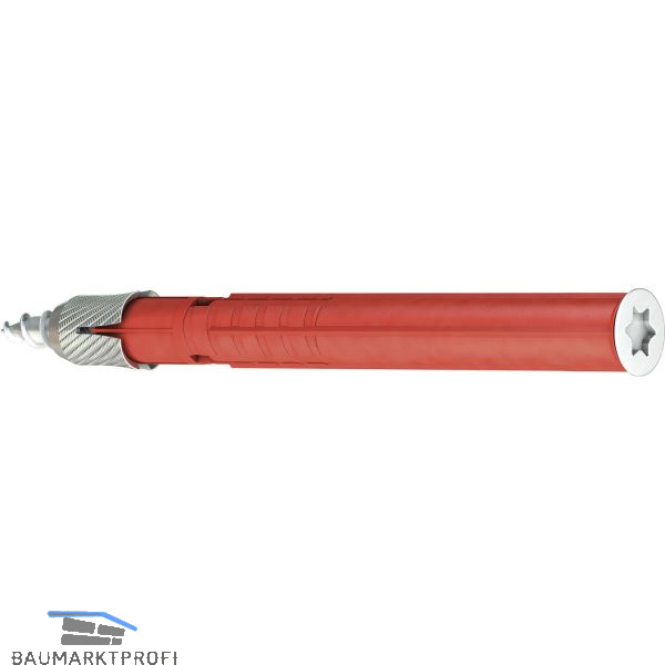 Mit 3-fach geteiltem Spreizkörper mit Metallspitze, Schaft mit Drehsicherungen, Senkkopf und vormontierter, galvanisch verzinkter Senkkopfschraube.
