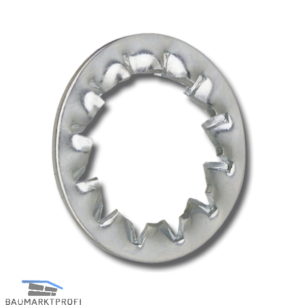 Scheibe mit überlappter Innenverzahnung, geeignet für Befestigungen mit beschränkten Anziehmomenten. Im Vergleich zu der Aussenzahnscheibe ist diese Scheibe für nicht ebene Auflageflächen geeignet.