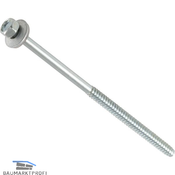 Dichtschrauben aus Vergütungsstahl verzinkt, mit Sechskantkopf nach DIN7976, mit fix aufmontierter Dichtscheibe ø 16 mm aus Stahl verzinkt und aufvulkanisierten EPDM-Dichtungen.