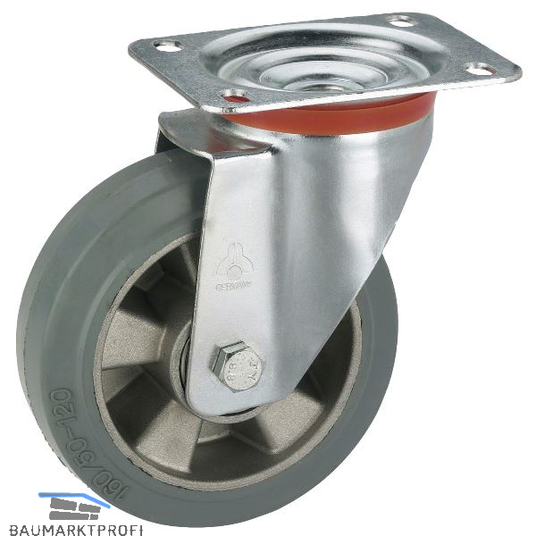 Wabenfelge aus Aluminium-Druckguss mit grauem (bei Ø 250 mm mit schwarzem) Elastik-Vollgummireifen und Kugellager im Drehkranz.