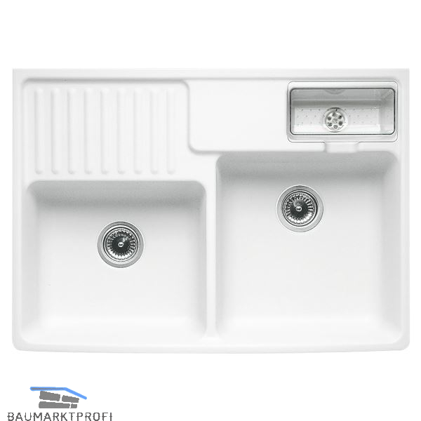 inkl. Drehknopf-Siebkorbüberlaufventil 3 1/2", Ablaufverbindung, kein Bohrloch durchgeschlagen, Resteschale, Befestigungssatz, Rückwand geschliffen