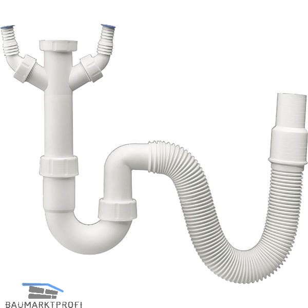 Höhen- und seitenverstellbarer Geruchverschluss mit flexiblem AnschlussschlauchAbgangsrohr mit zwei Kombi-Anschlusstüllen, je 3/4" oder 1" für Waschmaschine und Geschirrspülerflexibler Schlauch nach Bedarf kürzbar