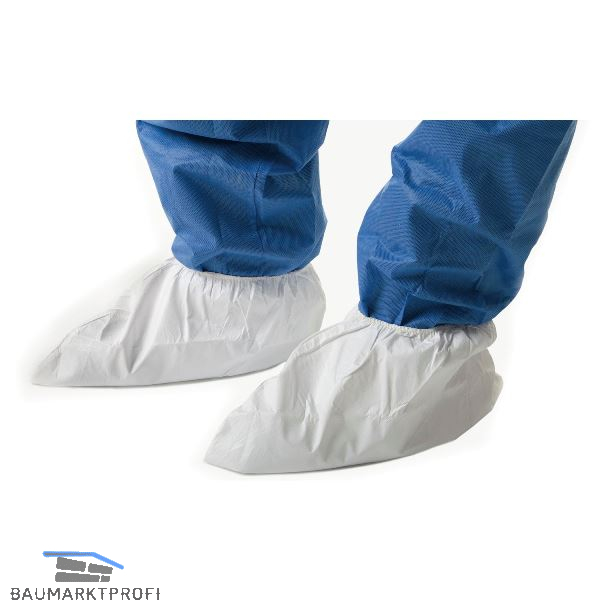 Überziehschuhe mit Elastikbund am Knöchel, aus fusselarmen, beschichtetem mikroporösen Material mit antistatischer Behandlung, Kat. 3 (Typ 5/6). Schützt vor gefährlichem Staub (Typ 5) und leichten Flüssigkeitsspritzern (Typ 6) und radioaktiven Partikeln (EN 1073-2:2002).