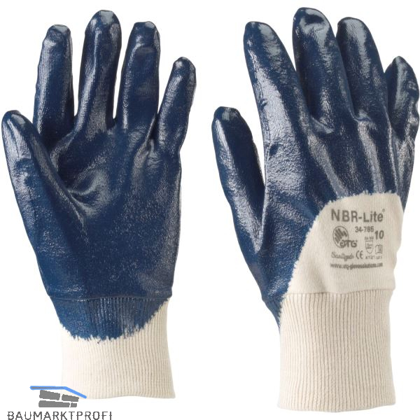 Flexible Nitril-Beschichtung auf Baumwoll-Gewebe. Hervorragende Werte bei Abtrieb-, Schnitt-, Stich- und Reißfestigkeit, gutes Tastgefühl, Handrücken unbeschichtet. Handschuh für feuchte, ölige und fettige Anwendung, Strickbund für einen guten Halt an der Hand.