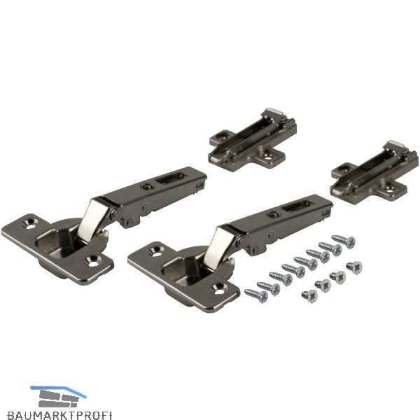 Lieferumfang:2 Stk. Clip-Scharnier schwarz Topfdurchmesser 35 mm2 Stk. Montageplatte 3 mm2 Stk. Distanzstück 3 mmSchrauben und Abdeckung mit Accuride-Logo