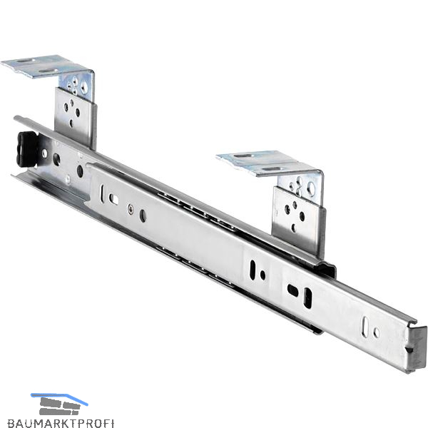 - Mit Trennhebel für die Rastung in ausgezogener Position sowie für das Trennen der Schiene. Die Möglichkeit zum Trennen erlaubt eine schnellere und einfachere Montage.