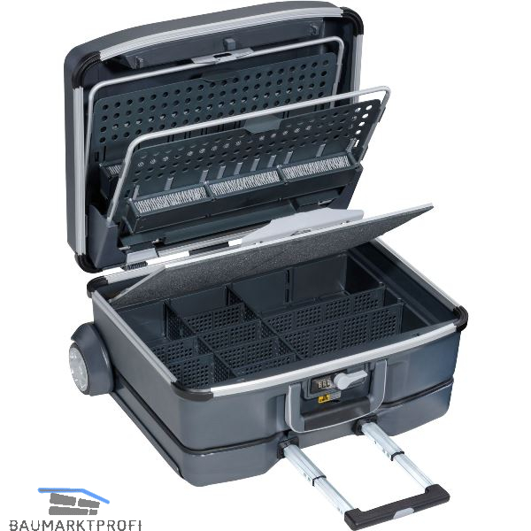 Service- und Montagekoffer mit Trolley-Fahreinheit in attraktivem Kofferdesign und einem Aluminiumrahmen mit stabilen Stoßecken. Innovative Deckelbremse mit Einrast- und Bremsfunktion, Zahlenschloss, Einhandzentralverschluss. Ergonomischer Zwei-Komponenten Griff. Ausstattung: Zwei Werkzeugträger mit Bürstenhalter sowie Gummischlaufen und Textilschlaufen, Trennstege in Schwalbenschwanzführung.