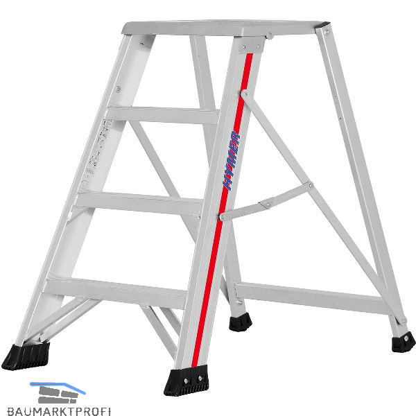 Einseitig begehbar, besonders geeignet für Lager- & Instandhaltungsarbeiten. Stabile Guss-Plattform mit 40x30cm Standfläche. Hohe Stabilität durch geschweißte Holm-Stufen-Verbindung. Bequeme, breite Stufen mit 8cm Stufentiefe. Starre Strebe gegen unbeabsichtiges Zusammenklappen. Geringer Platzbedarf bei Lagerung und Transport.