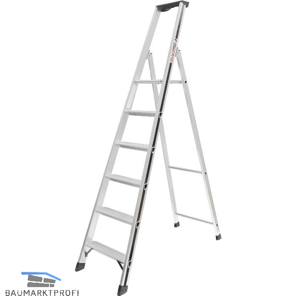 Konisch, einseitig begehbar, mit geräumiger funktionaler Ablageschale aus hochfestem Kunststoff, Eimerhaken mit 10 kg Tragkraft, rutschhemmende Leiterschuhe, Stufen mit Holm bündig, Verwindungssteif durch verbördelte Holm-Stufen-Verbindung, abgerundete Stufenrückseite, Plattformgröße 250 × 250 mm, Stufentiefe 80 mm. Tragkraft 150 kg.