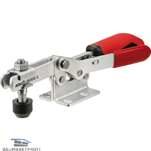 Für Spannstellung und geöffnete Stellung. Mit offenem Haltearm und waagrechtem Fuß, verzinkt und passiviert, mit ergonomischem ölbeständigen 2 K- Handgriff und Fingerschutz. Einsatzgehärtete und gefettete Lagerbuchsen. Niete aus rostfreiem Stahl. Verliersicherung für die Andrückschraube am Spannarm-Ende. Komplett mit vergüteter, verzinkter Andrückschraube Nr. 6890.