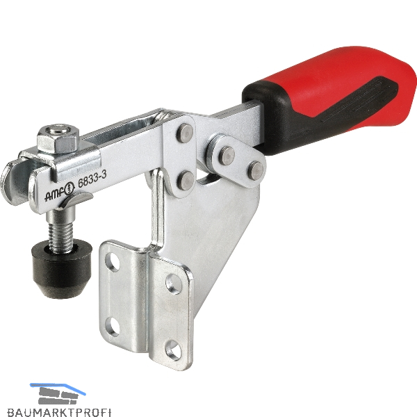Mit offenem Haltearm und Winkelfuß, verzinkt und passiviert, mit ergonomischem ölbeständigen 2 K- Handgriff. Einsatzgehärtete (bei 2 und 3) und gefettete Lagerbuchsen. Niete aus rostfreiem Stahl. Verliersicherung für die Andrückschraube am Spannarm-Ende. Komplett mit vergüteter Andrückschraube Nr. 6890.