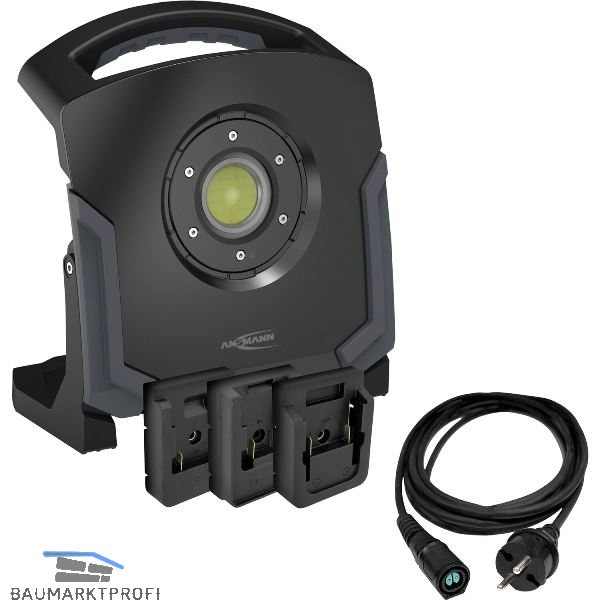 Arbeitsleuchte mit 18V Adapterplatten für Akkus und Netzkabel. Robustes Kunststoffgehäuse mit integriertem Tragegriff. Vier Helligkeitsstufen sind über den Ein/Aus- Schalter wählbar. Akkukapazitätsanzeige sowie Leistungsanzeige. Möglichkeit zur Stativaufnahme. 5 Meter Netzkabel mit Schnellverriegelung. Beleuchtungsstärke bis zu 9000 Lux. Lichtstrom bis zu 6350 Lumen. Schutzart: IP65 im Akkubetrieb (mit Abdeckung) und IP44 im Netzbetrieb.