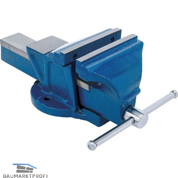 Parallelschraubstock mit Amboss. Aus Spezialguß. Nach vorn öffnend. Ambossfläche für Richt- und Staucharbeiten geeignet. Drehspindel verdeckt und gegen Schmutz geschützt. Mit gehärteten und angerauten Spannbacken. Vorgebohrte Löcher zur Montage auf einer Werkbank.