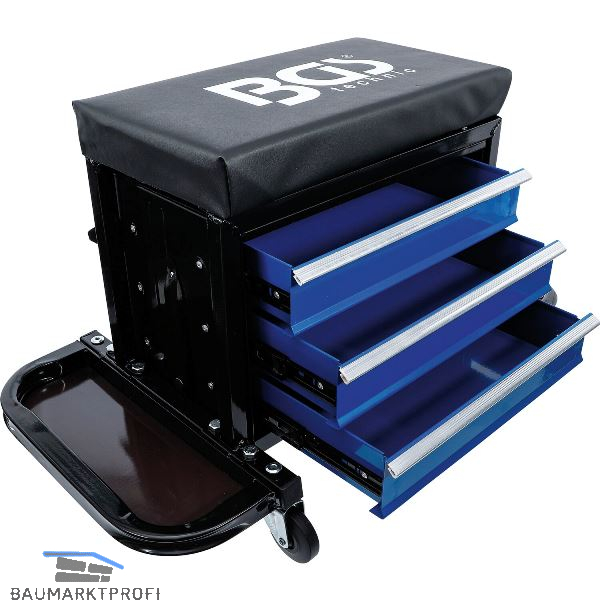 Robuster und fahrbarer Rollsitz. Mit Aufbewahrungsebenen zur Ablage von Werkzeugen und Kleinteilen. Abwaschbarer Polsterbezug. Stabile Stahl-Vierkantrohr-Konstruktion. 2 Seitenablagen, magnetisch. Schubladenbelastbarkeit: 5 kg pro Schublade.