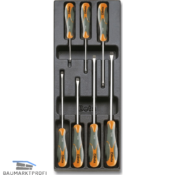 Ausstattung: je 1 Schlitzschraubendreher, 2,5 x 50, 3 x 75, 3,5 x 100, 4 x 125, 5,5 x 100, 5,5 x 150, 6,5 x 150 mm.