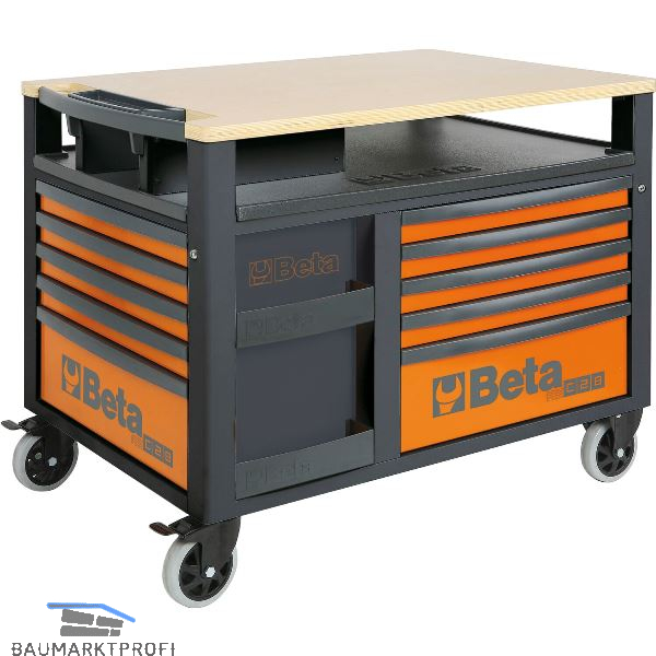 2 starre und 2 lenkbare Räder (mit Bremse) mit ø 150 mm. System zur schnellen und sicheren Öffnung und Schließung der Schubladen mit Frontblende aus Nylon und Glasfaser. Doppelte Zentralverriegelung mit Sicherheitsschloss. Multiplex-Arbeitsplatte mit Bohrungen zum Anbringen eines Schraubstocks. 4 Flaschenhalter an der Rückseite. 6 seitliche Aufnahmeschalen für Kleinteile. Seitliches Fach mit versenkbarer Tür und Schloss. Durchgehendes 135 mm hohes Fach mit Kunststoffabdeckung.