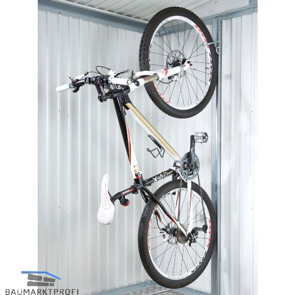 Für die platzsparende Aufbewahrung der Fahrräder. Für Fahrräder bis zu einer Größe von 29-Zoll. Aufhängehaken 8-fach verstellbar. Integrierte Absperröse für Fahrradschloss.