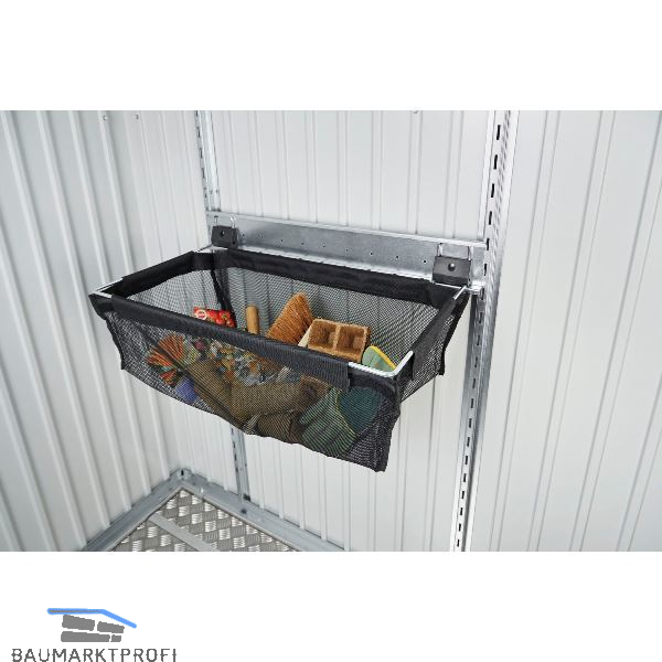 Ideal zum Aufbewahren von Kleinteilen, inklusive Wandschiene zum Einhängen in 2 Regalsteher (nicht im Lieferumfang enthalten). Sack aus schwarzem Polyestergeflecht. Belastbar bis max. 10 kg.