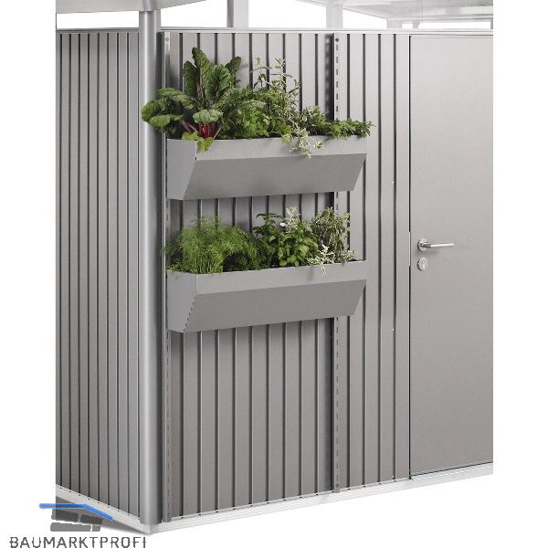 Zwei Steher (Höhe 1880 mm) werden in der Farbe des Gerätehauses an der Außenwand angeschraubt und die Blumenkästen in beliebiger Höhe eingehängt. Kunststoffeinsätze, zur einfacheren Bepflanzung, werden standardmäßig mitgeliefert.