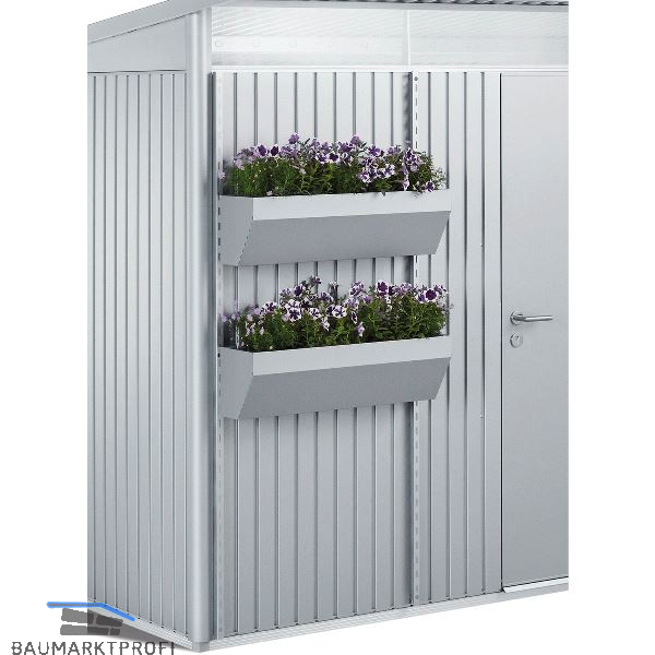 Zwei Steher (Höhe 1880 mm) werden in der Farbe des Gerätehauses an der Außenwand angeschraubt und die Blumenkästen in beliebiger Höhe eingehängt. Kunststoffeinsätze, zur einfacheren Bepflanzung, werden standardmäßig mitgeliefert.