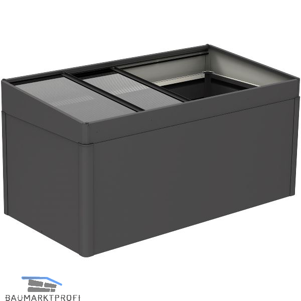 Effizienter Frostschutz und gute Zugänglichkeit durch 4 verschiebbare Doppelstegplatten, die sich leichtentfernen lassen. Der Frühbeetaufsatz ist sturmfest und mit einem Regenwasserablauf ins Innere des HochBeets ausgestattet.