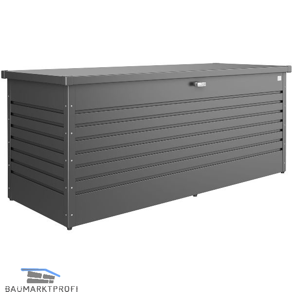 Marke: Biohort Farbe: Dunkelgrau-metallic Volumen (l): 1050 Außenmaß (mm): 2010 x 790 x 830 Innenmaß (mm): 1920 x 705 x 775 Gewicht (kg): 52 Grundausstattung: Gasdruckfeder, Drehgriff-Zylinderschloss Type: FreizeitBox 200