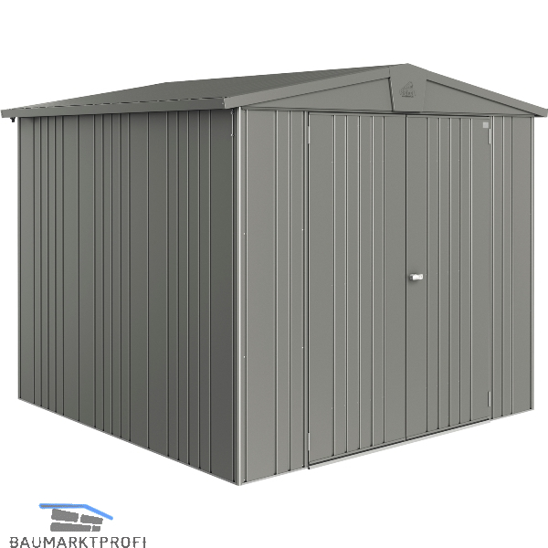 Grundausstattung: 2 Regalböden, 2 Regalsteher zum Einhängen der Regalböden in beliebiger Höhe, 4 Gerätehalter, Ordnungssystem mit 6 Aufhängehaken, 2 integrierte Dachrinnen inkl. Anschluss für 1-Zoll Schlauch, Drehgriff-Zylinderschloss, Schrauben und Dübel für die Befestigung