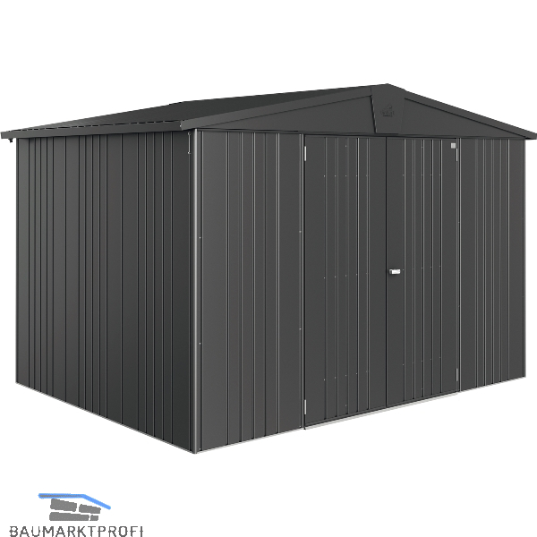 Grundausstattung: 2 Regalböden, 2 Regalsteher zum Einhängen der Regalböden in beliebiger Höhe, 4 Gerätehalter, Ordnungssystem mit 6 Aufhängehaken, 2 integrierte Dachrinnen inkl. Anschluss für 1-Zoll Schlauch, Drehgriff-Zylinderschloss, Schrauben und Dübel für die Befestigung