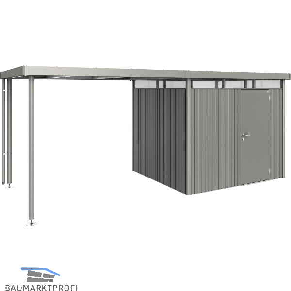 Das Seitendach wird am Gerätehaus HighLine® (ab Gr. H2) jeweils an der Seite mit der Regenrinne – wahlweise ein- oder beidseitig – fixiert. So entsteht eine überdachte Freifläche im Ausmaß der einfachen/doppelten Grundfläche des Gerätehauses. Die Alu-Stützen sind mit höhenverstellbaren Füßen ausgestattet. Die Dachfläche des Seitendaches ist immer quarzgrau-metallic!