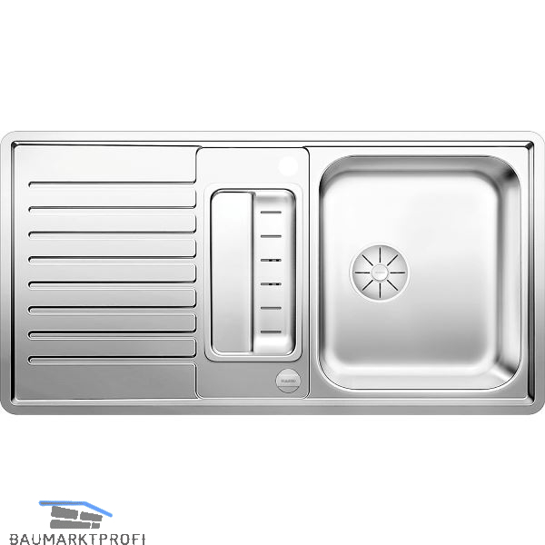 Ausgewogene, zeitlose Optik, Hauptbecken mit klarer Kontur und modernem Siebkörbchen