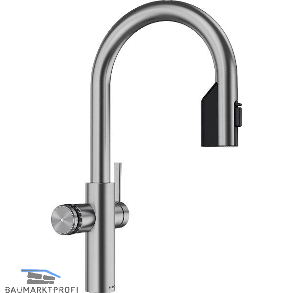 - Gourmet-Wasser: Die Armatur liefert gefiltertes Wasser – gekühlt, sprudelnd (still, medium, classic) oder kochend heiß – zusätzlich zu normalem Kalt- und Warmwasser.