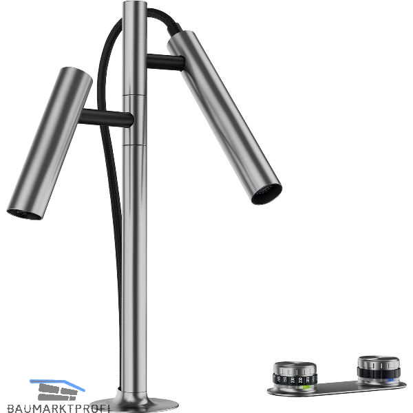 - Zwei Auslässe sind an der schlanken, zentralen Säule befestigt. Einer für das veredelte Wasser (z.B. gefiltert, sprudelnd usw.) und ein mobiler Brausekopf für normales Wasser.