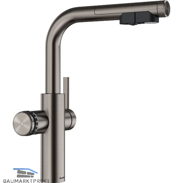 - Gourmet-Wasser: Die Armatur liefert gefiltertes Wasser – gekühlt, sprudelnd (still, medium, classic) oder kochend heiß – zusätzlich zu normalem Kalt- und Warmwasser.